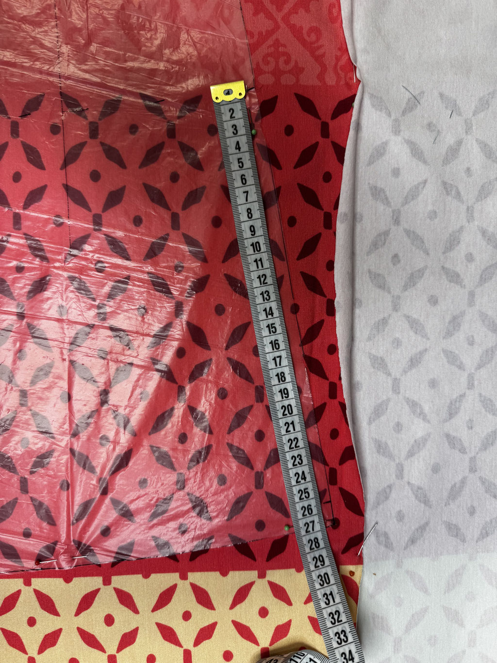 Dann habe ich seitlich gemessen, an welcher Stelle der Musterübergang auf dem Schnittteil liegt, ums es bei den anderen Schnittteilen entsprechend platzieren zu können. So ist ein sauberer Übergang an den Seiten gesichert.