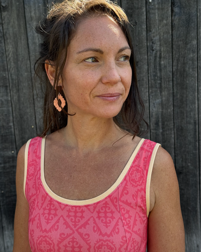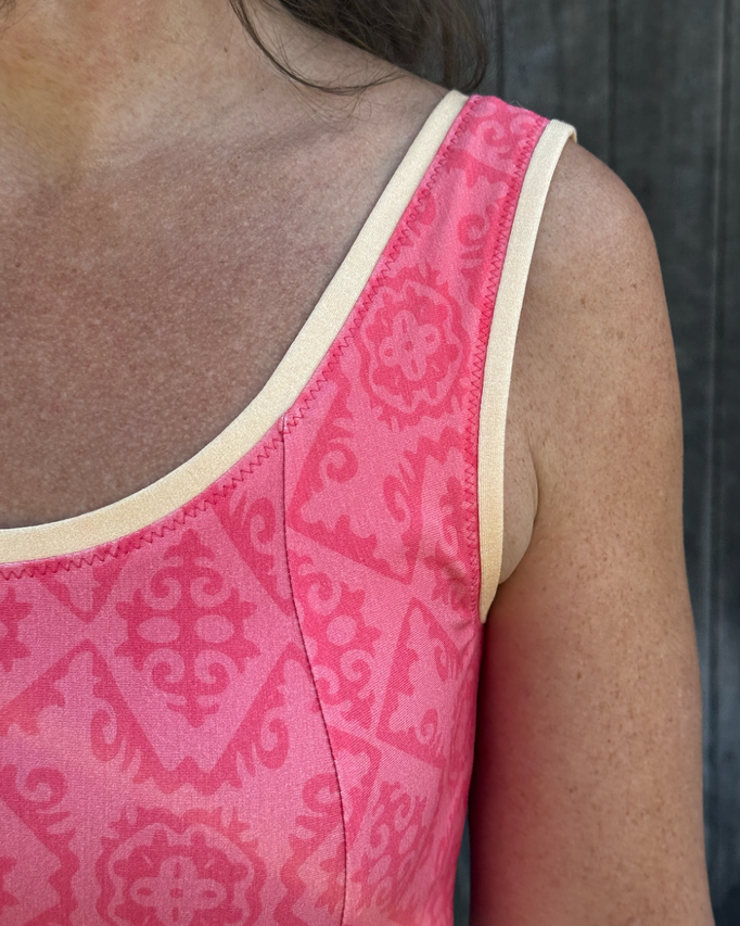Für den Saumabschluss habe ich den peachfarbenen Unistreifen abgeschnitten und die Stoffkante damit eingefasst.